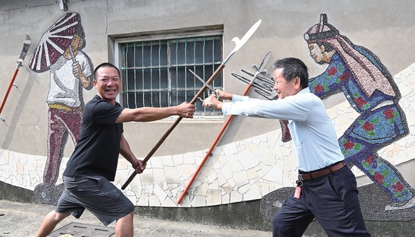 ▲走讀導覽中也能親身拿著宋江陣兵器與牆面上的人物陣式作互動。