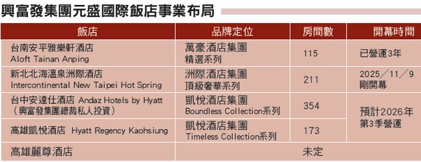 目前集團旗下的4家國際品牌酒店,各自依據不同城市特性,制定出符合市場需求的定位。如2022年開幕的台南雅樂軒酒店,主打年輕、時尚,適合旅遊團與年輕旅客;2025年底新開幕的新北北海溫泉洲際酒店,則為洲際酒店最高端的Intercontinental系列,致力打造全台頂極的奢華度假溫泉酒店。另外高雄凱悅及由興富發集團總裁私人投資的台中安達仕酒店,則預計於2026下半年陸續啟用,勢必將成為各城市的指標性住宿選擇。