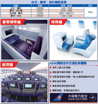 中國南方航空是中國唯一一家運營 A380超大客機,已連續33年客運量、機隊規模居中國大陸各航空公司之首,並是亞洲唯一進入世界航空客運前3強,晉升國際一流航空公司的航列。南航自10╱12起使用A380執飛「廣州─ 洛杉磯」航線,並且以「南航A380飛翔從此大不同」為口號,盼再締造前所未有的飛行體驗。