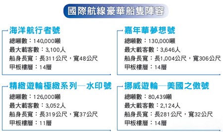 皇家加勒比遊輪的海洋航行者號於今年推出的3個行程,分別為「基隆─沖繩─基隆3日」、「基隆─福岡─長崎─基隆 6日」和「基隆─長崎─別府─神戶─基隆8日」,3日短天期的行程主打上班族客群,將在週五下午3點出發,週日上午10 點抵達基隆港;8日長天期的行程主打銀髮族客群,最北邊的港口將會停靠到神戶;6日的中天期行程主打大眾市場,根據前2年操作的經驗,此天數為旅客最熟悉的天數,目前已推出早鳥優惠,可望刺激買氣。