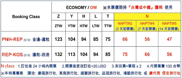 為感謝台籍旅客的支持,吳哥航空在尚未開航台北直飛航線前,特別推出國內線優惠票價給持用『台灣護照』的旅客使用。金邊PNH─暹粒REP特惠機票只需47.USD起(未稅),暹粒REP─西港KOS機票56.USD起(未稅)。