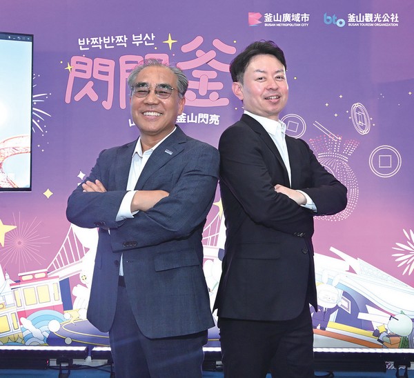 ▲(左起)釜山觀光公社社長李定實、全球市場行銷組組長Youngho Son。