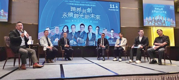 ▲「跨界共創永續觀光新未來」座談會,並集結來自旅宿、遊樂園、旅行業、休閒農業及學術界的重量級代表與談,由高雄餐旅大學研究所教授劉喜臨擔任主持人。