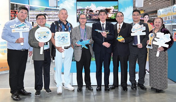 ▲越南航空業務副理李威震(左5)與參展旅行社業者合 影。
