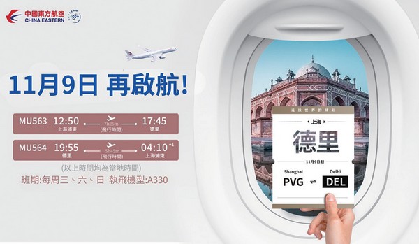 東航11╱9起將恢復上海往返印度德里航線,由A330-200執飛,每週三、六、日執行。去程航班號為MU563,12:50從上海浦東機場起飛,當地時間17:45抵達德里英迪拉·甘地國際機場;回程航班號為MU564,德里19:55起飛,次日04:10抵達上海浦東(...
