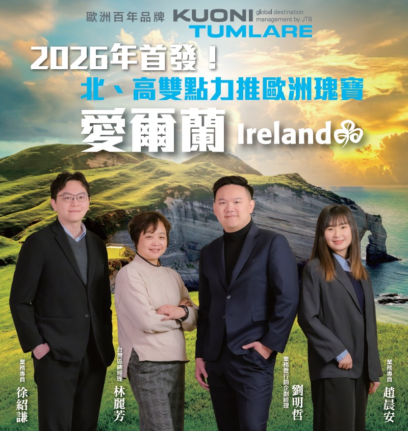 作為歐洲百年品牌的Kuoni Tumlare,擁有豐富的目的地管理經驗,在全球各地設有專業的操作團隊,提供旅客全方位的服務內容。針對台灣市場,為加強推廣愛爾蘭旅遊,愛爾蘭旅遊局特別攜手Kuoni Tumlare(以下簡稱KT)於1/6在高雄日航酒店,以及1/8在台北喜來登酒...